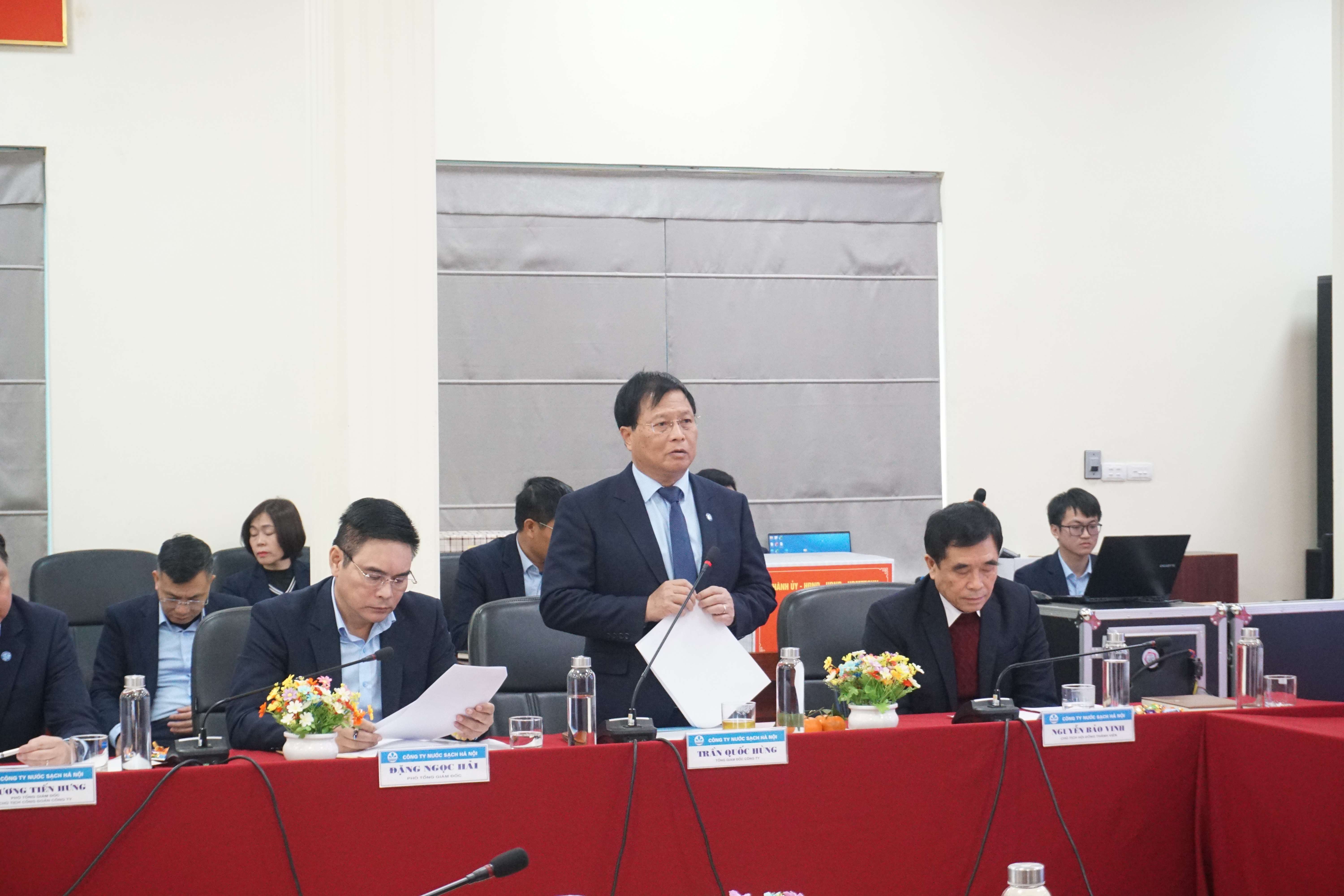 Thay mặt Ban lãnh đạo Công ty, đ/c Trần Quốc Hùng, Phó Bí thư Đảng ủy, Tổng Giám đốc đã báo cáo với đoàn công tác kết quả sản xuất kinh doanh năm 2023 và phương hướng hoạt động năm 2024. Công ty Nước sạch Hà Nội được UBND Thành phố Hà Nội giao quản lý, cung cấp nước sạch cho 16 quận huyện với tổng dân số cấp nước 3,6 triệu người (trong đó cấp nước trực tiếp cho 8 quận, huyện gồm: Ba Đình, Đống Đa, Hai Bà Trưng, Hoàng Mai, Cầu Giấy, Tây Hồ, Bắc Từ Liêm, một phần quận Nam Từ Liêm, huyện Thanh Trì và 4 xã trung tâm huyện Mê Linh, khu công nghệ cao Hòa Lạc và cấp nguồn qua đồng hồ tổng cho Công ty CP Nước sạch số 2 HN và Công ty CP Nước sạch số 3 HN để cấp nước cho quận Hoàn Kiếm và quận Long Biên, các huyện Gia Lâm, Đông Anh, Sóc Sơn, một phần huyện Mê Linh). Kết quả hoạt động sản xuất cấp nước năm 2023: Tổng sản lượng nước cấp bình quân vào mạng: 720.000 ~ 770.000 m3/ngđ, tăng 2,8%/KH, tăng 6,5% so với cùng kỳ. Trong đó: Nước do Công ty tự sản xuất trung bình 600.000 m3/ngđ ~ 82%, mua nước sông Đà, sông Đuống 130.000 m3/ngđ. 100% dân số trên địa bàn quản lý của Công ty được sử dụng nước sạch. Công tác ứng dụng công nghệ thông tin vào SXKD được đẩy mạnh thông qua việc 100% thu tiền nước trực tuyến không dùng tiền mặt. Tổng doanh thu đạt 2.189 tỷ đồng, tăng 8.73%/KH. Công ty kiên trì tập trung mọi nguồn lực sẵn có, kết hợp với hiệu quả của dự án tiếp nhận phần mềm LeakReduk hợp tác với Công ty Hydroscan (Vương quốc Bỉ) thực hiện công tác chống thất thoát thất thu nước sạch đạt tỷ lệ nước thu tiền: 87,69%, tăng 1%/KH, tăng 2,69% so với lộ trình giảm thất thoát nước sạch của Thành phố giao. Nộp ngân sách Nhà nước 390 tỷ đồng, đạt 133% KH. Lợi nhuận sau thuế đạt 152 tỷ, đạt 130% KH. Công ty đảm bảo chăm lo công ăn việc làm, thu nhập của người lao động. Thu nhập của người lao động đạt trên 11 triệu đồng/người/tháng.