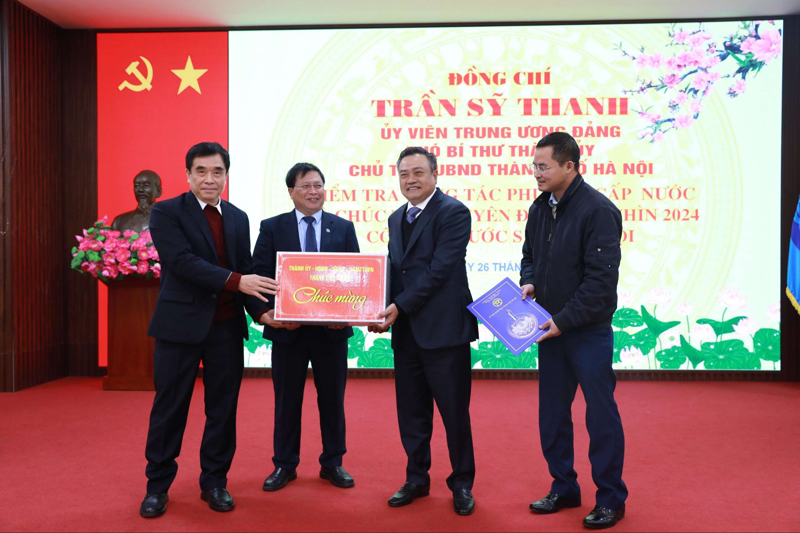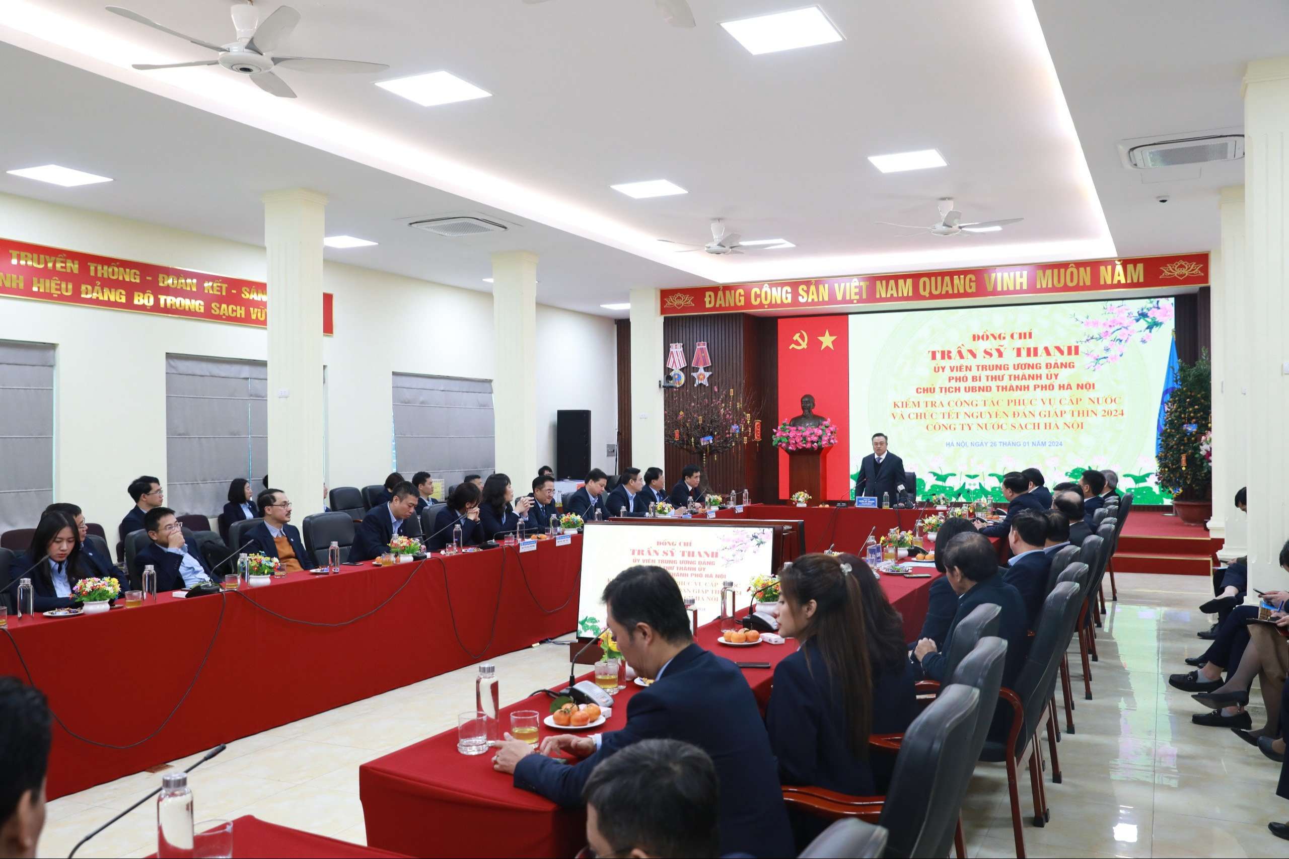 Chiều ngày 26/01/2024, Đoàn công tác của Thành ủy Hà Nội do đồng chí Trần Sĩ Thanh, Uỷ viên BCH TW Đảng, Phó Bí thư Thành ủy, Chủ tịch UBND Thành phố Hà Nội làm trưởng đoàn đã đến kiểm tra công tác cấp nước phục vụ nhân dân Thủ đô trong dịp Tết Nguyên đán và thăm chúc tết CBCNV Công ty Nước sạch Hà Nội.