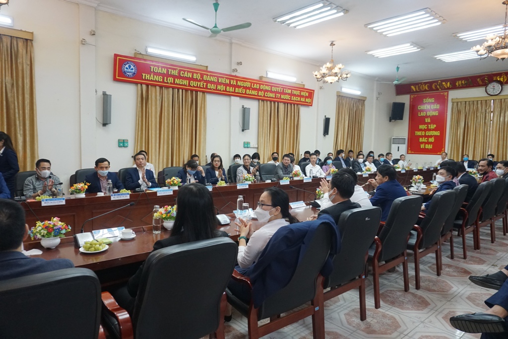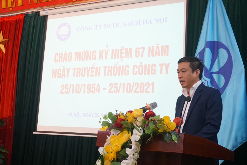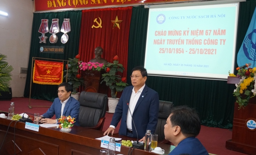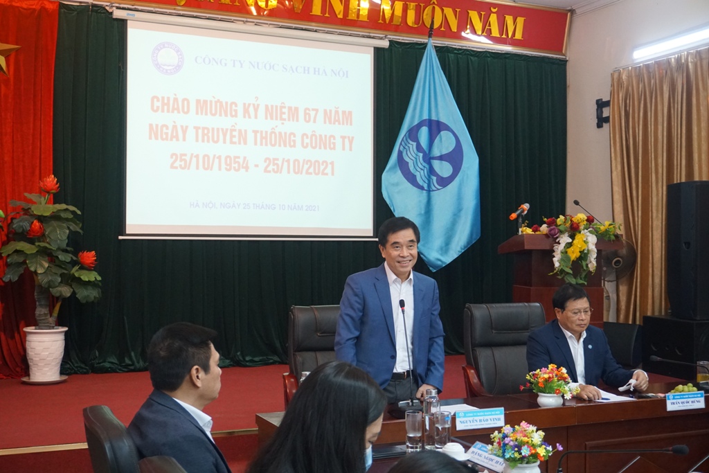 Mở đầu chương trình, ông Nguyễn Bảo Vinh, Bí thư Đảng ủy, Chủ tịch Hội đồng Thành viên đã ôn lại lịch sử của ngành nước Hà Nội. Từ tháng 10/1954, mỗi con phố ở Hà Nội chỉ có một đầu máy nước sinh hoạt chung, người dân phải xếp hàng gánh nước về nhà. Với sự cố gắng, nỗ lực không ngừng của những người công nhân ngành nước qua các thời kỳ, đến nay hệ thống cấp nước Thành phố Hà Nội không ngừng hoàn thiện đáp ứng cấp nước đến từng hộ dân trên địa bàn Thủ đô Hà Nội. Đội ngũ CBCNV trong những năm qua cũng không ngừng trưởng thành, đoàn kết, Công ty đã triển khai hoàn thành Dự án nâng công suất nhà máy nước Bắc Thăng Long lên 150.000 m3/ngđ lấy nguồn từ nguồn nước mặt sông Hồng, đã đánh dấu bước ngoặt về khả năng làm chủ công nghệ, kỹ thuật khai thác xử lý nước mặt song cùng với khai thác nước ngầm. Tỷ lệ nước thu tiền toàn Công ty đạt 85%, hoàn thành mục tiêu theo Quyết định số 2417/QĐ-Ttg của Thủ tướng Chính phủ. Năm 2021, dù gặp nhiều khó khăn do diễn biến phức tạp của dịch bệnh COVID-19 trên địa bàn, Công ty đã áp dụng các biện pháp chủ động đảm bảo an toàn sản xuất cấp nước và phòng chống dịch bệnh. Bên cạnh đó, Công ty vẫn tiếp tục xây dựng kế hoạch cải tạo mạng lưới chống thất thoát thất thu nước sạch, kiểm soát chất lượng nước online, hoàn thiện công tác thu tiền nước trực tuyến không dùng tiền mặt… để không ngừng nâng cao dịch vụ cấp nước trong các năm tiếp theo.