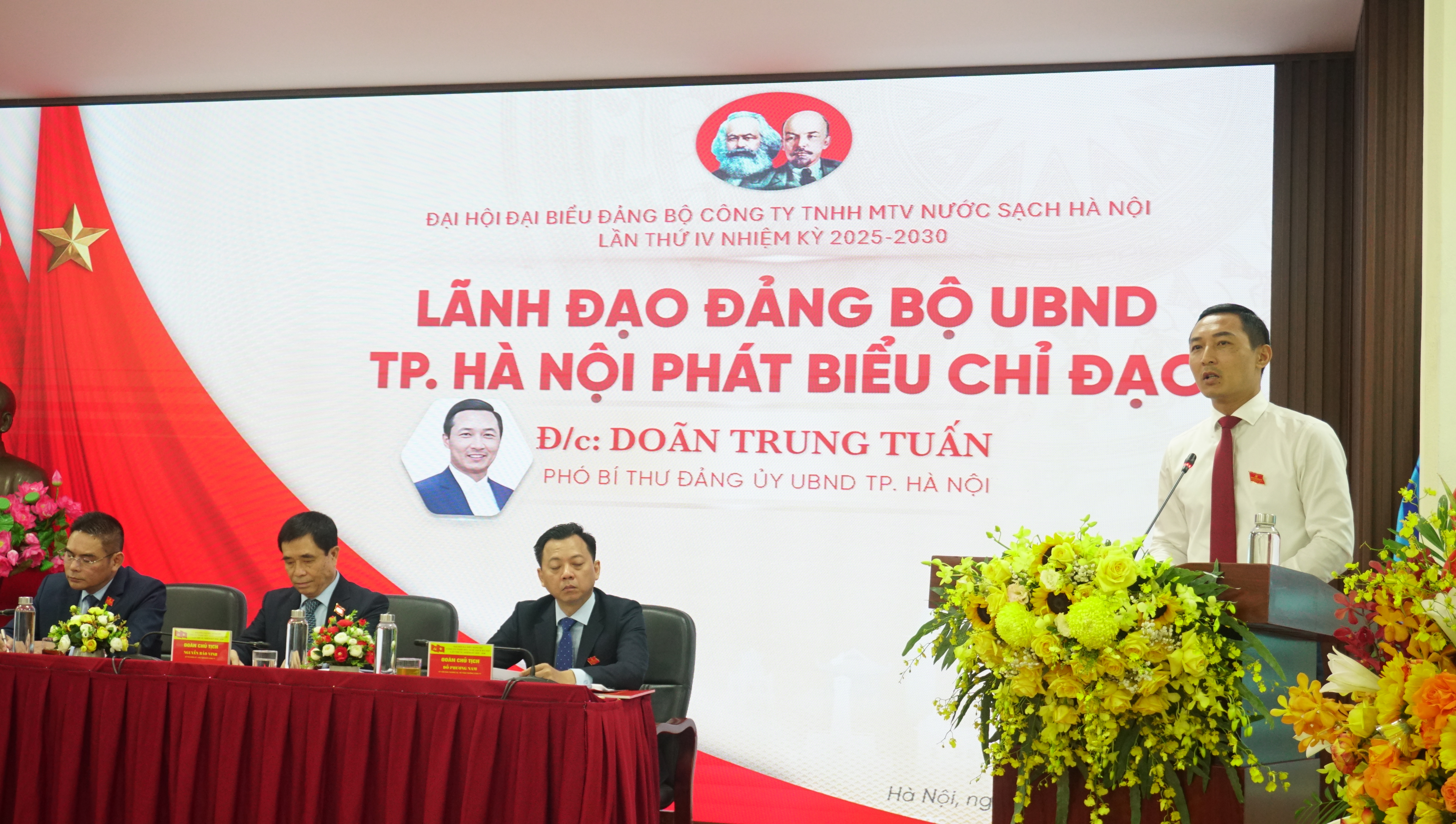 Thực hiện việc sắp xếp tinh gọn bộ máy “Tinh – gọn – mạnh – hiệu năng – hiệu lực – hiệu quả”, kể từ tháng 3/2025, Đảng bộ Công ty chính thức chuyển về trực thuộc Đảng bộ UBND Thành phố Hà Nội. Đại hội đã lắng nghe đồng chí Doãn Trung Tuấn, Phó Bí thư Đảng ủy UBND Thành phố Hà Nội phát biểu ý kiến chỉ đạo. Đồng chí nhiệt liệt biểu dương những thành tích, kết quả hoạt động của Đảng bộ Công ty trong nhiệm kỳ 2020 – 2025. Đánh giá cao nội dung của Báo cáo chính trị, Báo cáo kiểm điểm của BCH Đảng bộ Công ty Nước sạch Hà Nội, đồng chí đã nêu ra 5 ý kiến chỉ đạo cụ thể với Đại hội về những nhiệm vụ, giải pháp trọng tâm để Đảng bộ Công ty thực hiện trong nhiệm kỳ tới. Thứ nhất, tiếp tục thực hiện tái cơ cấu doanh nghiệp theo chủ trương của Nhà nước, định hướng phát triển bền vững, giữ thị phần hiện tại và mở rộng suất đầu tư sang các khu vực ngoài thành. Thứ hai, tập trung các giải pháp để nâng cao hiệu quả sản xuất kinh doanh trong đó tập trung đầu tư vào ứng dụng công nghệ số để nâng cao hiệu quả quản lý, điều hành xây dựng bản đồ số về hệ thống cấp nước Thủ đô Hà Nội. Thứ ba, có những giải pháp cụ thể để tiếp tục nâng cao tỷ lệ nước thu tiền và chất lượng dịch vụ cấp nước phục vụ nhân dân. Thứ tư, phối hợp chặt chẽ với các Công ty cấp nước, Công ty thoát nước, Tổng Công ty Điện lực Hà Nội… để đảm bảo công tác sản xuất cấp nước trong các ngày đại lễ, kỳ cuộc quan trọng của Thủ đô. Xây dựng các kịch bản và giải pháp tháo gỡ khó khăn khi có sự cố bất ngờ xảy ra. Thứ năm, trong nhiệm kỳ mới tiếp tục phát huy kết quả xây dựng Đảng bộ vững mạnh, khẳng định vai trò lãnh đạo toàn diện của tổ chức Đảng trong sản xuất kinh doanh, công tác phát triển Đảng viên mới. Nêu cao vai trò của các Chi bộ và Đảng viên, tính gương mẫu, tinh thần trách nhiệm, tiên phong trong các chương trình hành động của Đảng bộ.
