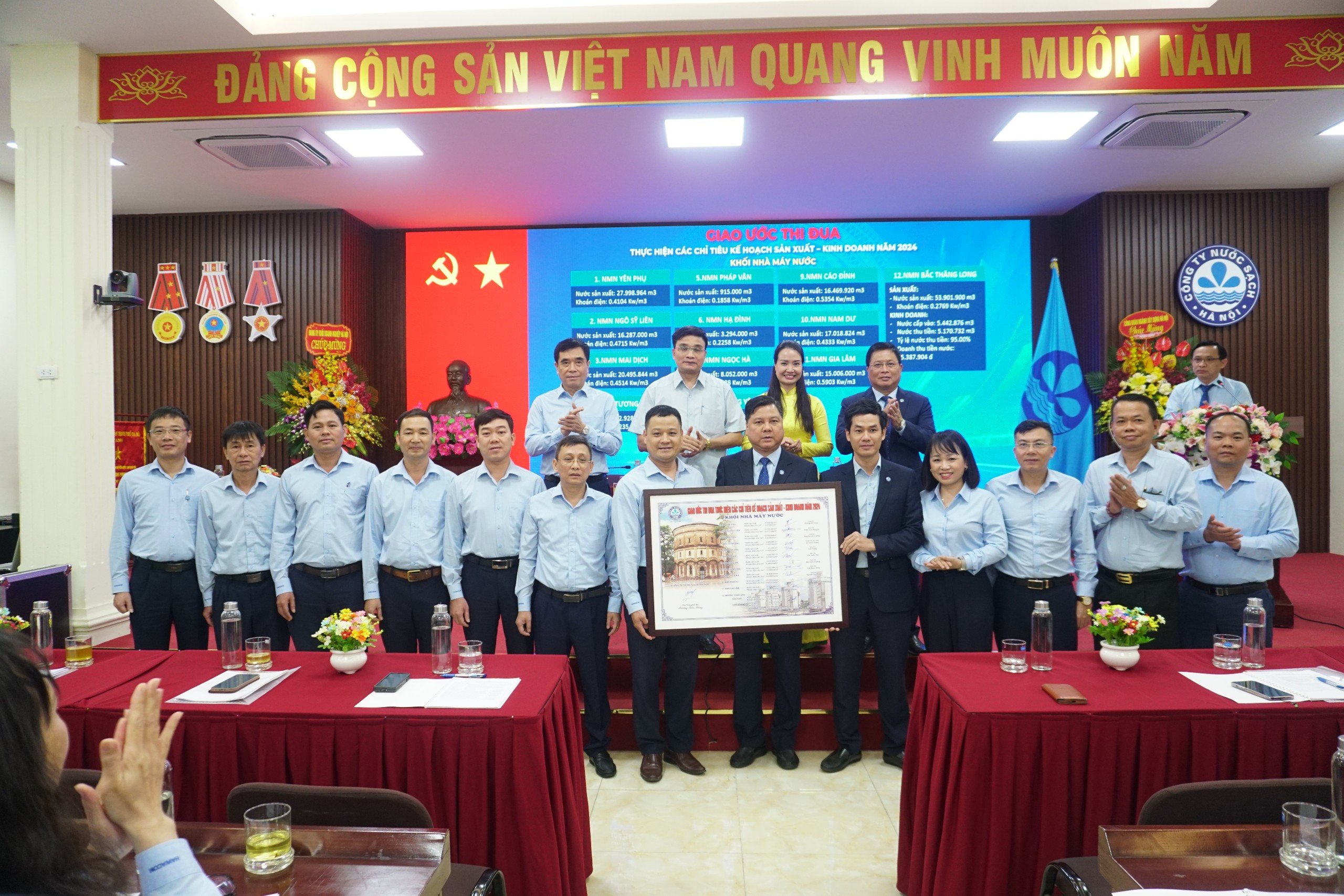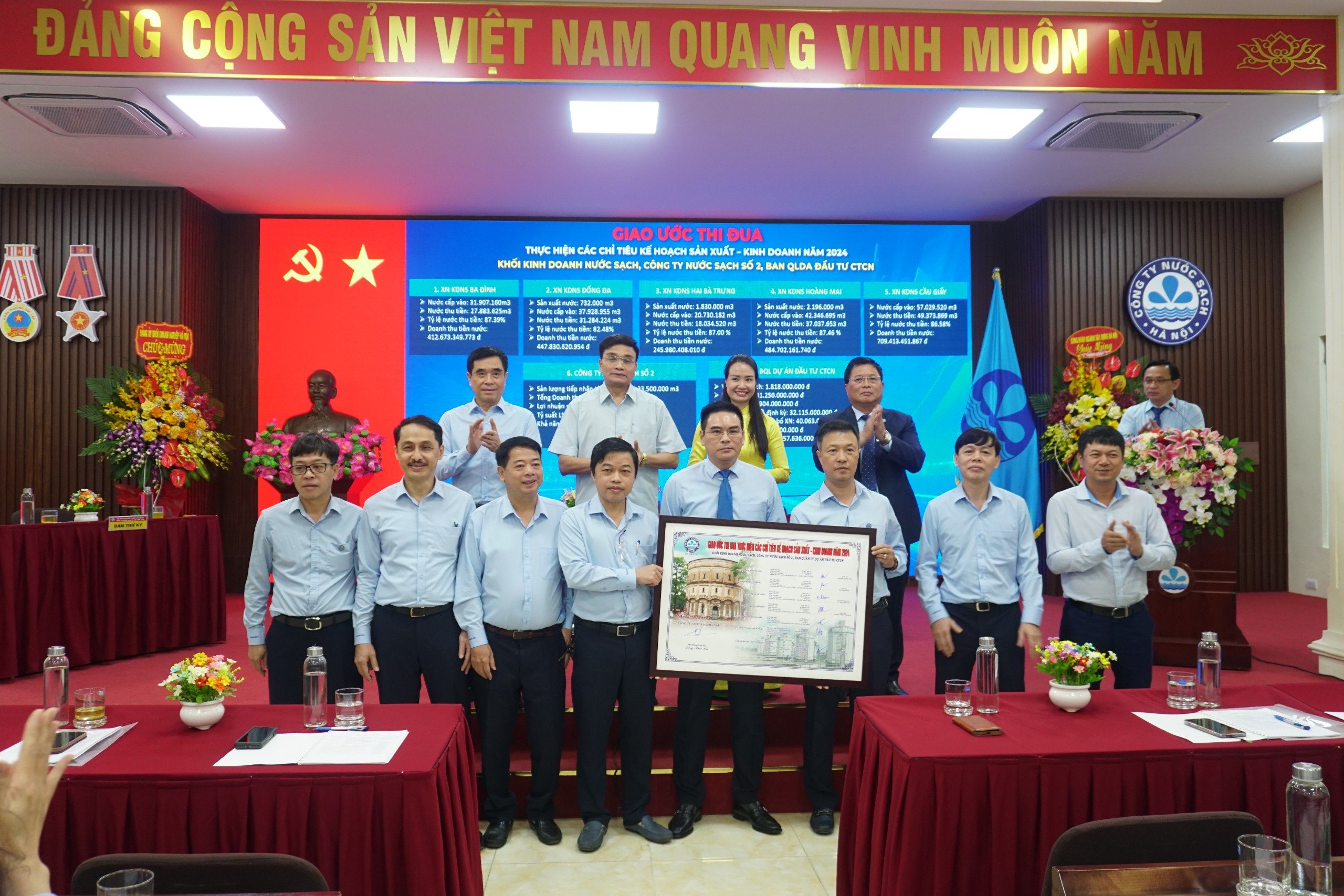 Hội nghị tiếp tục với phần Giao ước thi đua năm 2024 của các đơn vị Khối sản xuất nước, Khối kinh doanh và Khối phụ trợ thể hiện quyết tâm hoàn thành kế hoạch sản xuất kinh doanh năm 2024 của toàn thể CBCNV Công ty Nước sạch Hà Nội.