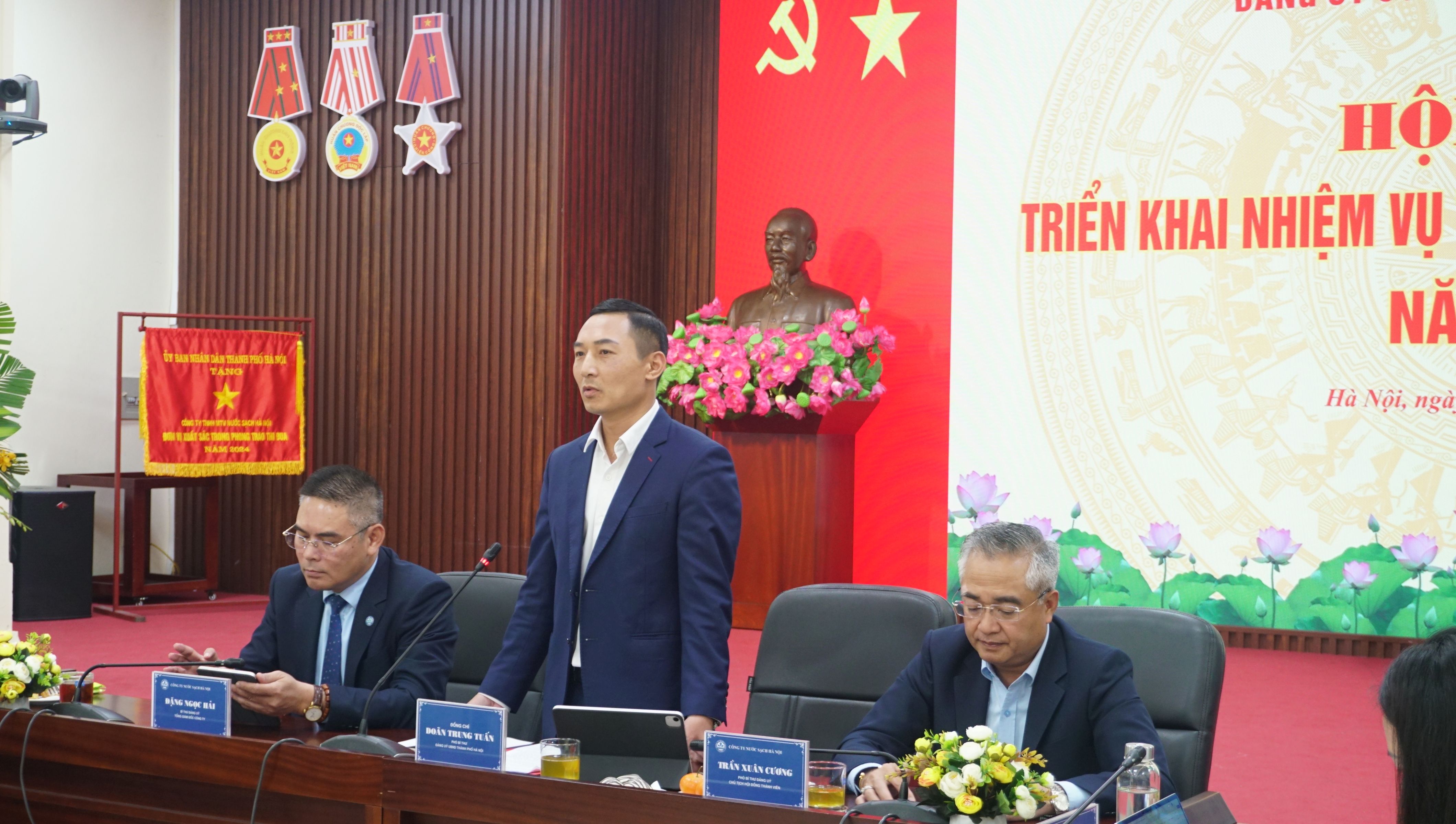 Trong thời gian qua, Đảng ủy UBND Thành phố luôn quan tâm, theo dõi, tạo điều kiện thuận lợi và chỉ đạo sát sao đối với Đảng bộ Công ty. Phát biểu tại Hội nghị, đ/c Doãn Trung Tuấn, Phó Bí thư Đảng ủy UBND Thành phố Hà Nội biểu dương những kết quả đã đạt được của Công ty trong năm 2025. Công ty đã phát huy truyền thống đoàn kết, thống nhất hoàn thành những chỉ tiêu, nhiệm vụ được giao. Thời điểm hiện tại, Hà Nội cũng như cả nước đã thực hiện chủ trương tinh gọn bộ máy, nâng cao hiệu lực, hiệu quả hoạt động của hệ thống chính trị với tư tưởng đột phá và phát triển. Với những chủ trương, tư tưởng, định hướng lớn, Hà Nội đang tích cực điều chỉnh, sửa đổi luật Thủ đô, Quy hoạch Thủ đô để xây dựng cơ chế phát triển đồng bộ. Công ty NSHN cần nghiên cứu Nghị quyết Đại hội Đảng bộ đã ban hành để có cái nhìn toàn diện về định hướng quy hoạch Thủ đô trong thời gian tới. Tiếp tục hoàn thiện mạng lưới cấp nước gắn chặt với những dự án hạ tầng hiện đại, có tính kết nối cao như các tuyến đường sắt đô thị: Nam Thăng Long - Trần Hưng Đạo, Văn Cao - Hòa Lạc; Các cầu qua sông Hồng; Trục đại lộ cảnh quan sông Hồng và khu đô thi thể thao Olympic… Hoàn thiện về mô hình phát triển doanh nghiệp, trong đó đẩy mạnh ứng dụng khoa học công nghệ, chuyển đổi số, đổi mới sáng tạo trong quản lý và sản xuất kinh doanh. Giữ vững giá trị cốt lõi đó là “chất lượng, ổn định, trí tuệ tận tâm, sáng tạo, hiệu quả”, từ đó từng bước chuyển đổi từ doanh nghiệp cung cấp dịch vụ truyền thống sang doanh nghiệp hiện đại, thông minh, bền vững, đáp ứng nhu cầu sử dụng nguồn nước sạch ổn định lâu dài theo quy hoạch phát triển của Thủ đô. Về công tác xây dựng Đảng, đồng chí mong muốn trong thời gian tới tiếp tục phát huy kết quả đã đạt được và khẳng định vai trò lãnh đạo của tổ chức Đảng, vai trò mỗi đồng chí cán bộ Đảng viên để 514 Đảng viên hiện tại là nòng cốt về tinh thần, trách nhiệm, tính kỷ cương, gương mẫu trong công việc cho khoảng 2600 người lao động toàn Công ty.