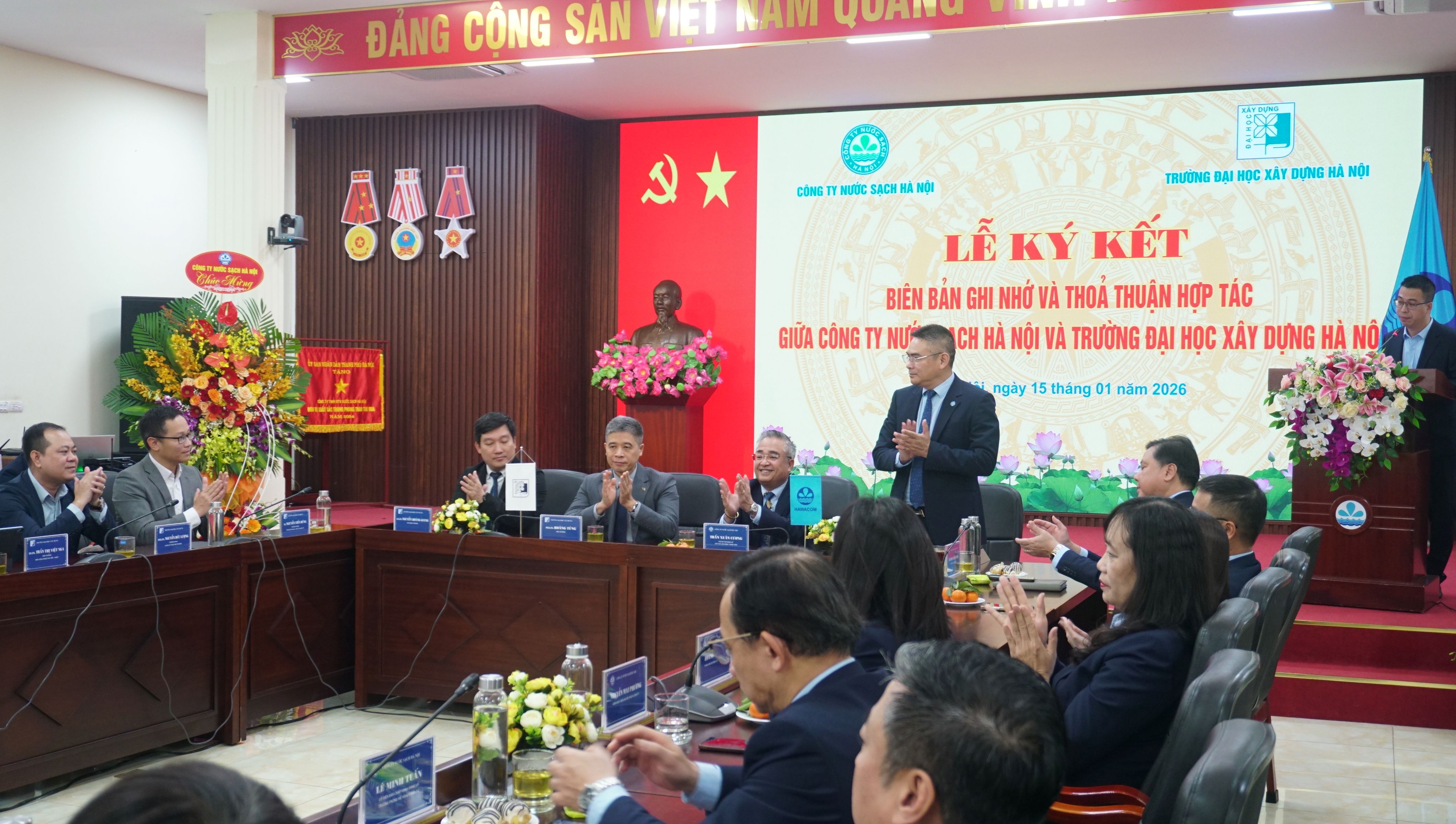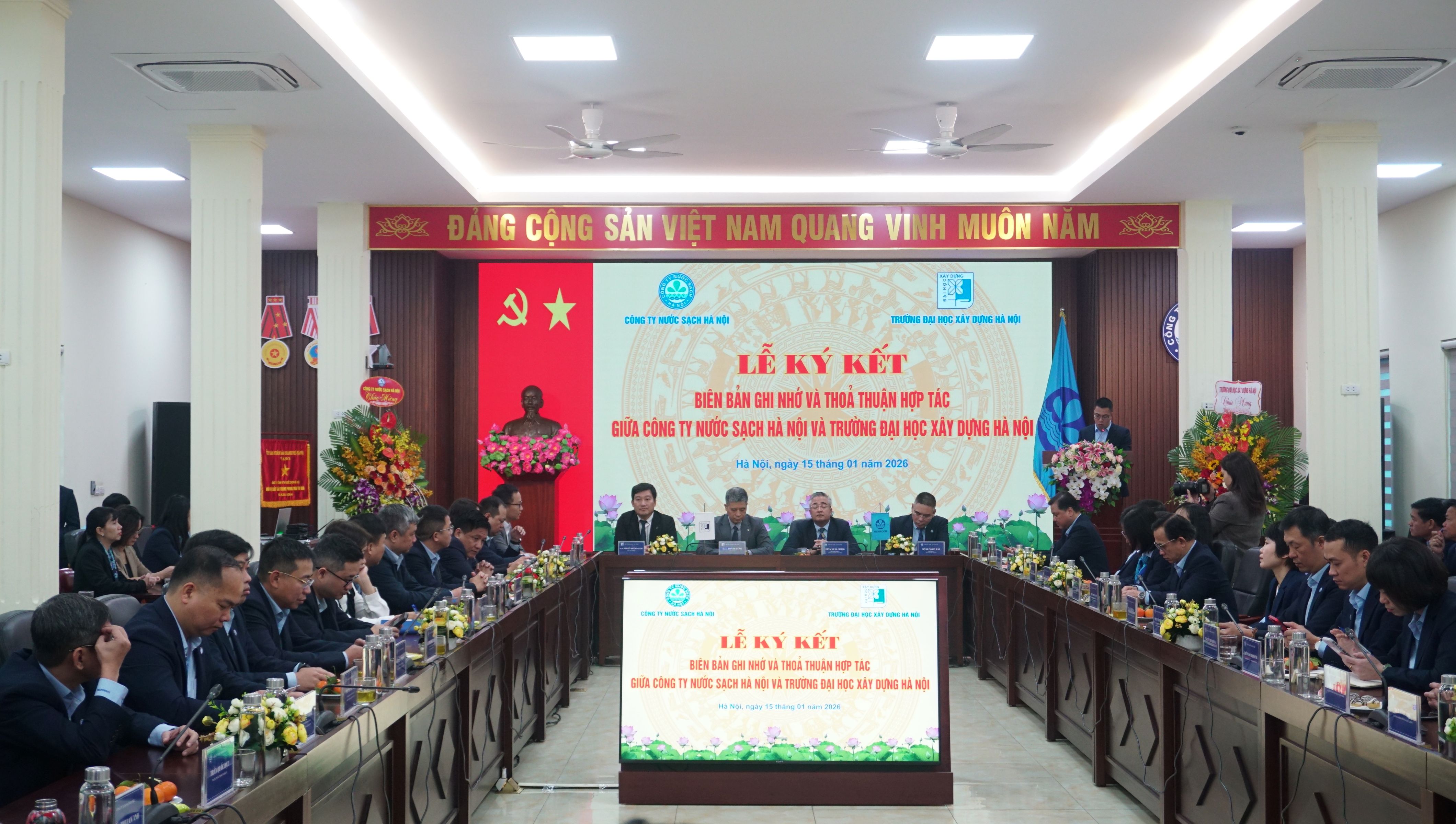 Sáng ngày 15/1/2026, Công ty NSHN đã tổ chức Lễ ký kết biên bản ghi nhớ và thỏa thuận hợp tác giữa Công ty NSHN và trường Đại học Xây dựng. Đây là cơ hội tăng cường công tác gắn kết trong đào tạo, nghiên cứu khoa học, nghiên cứu ứng dụng sản xuất thực tiễn, tư vấn phát triển ứng dụng khoa học công nghệ và chuyển đổi số trong lĩnh vực cấp nước phục vụ trực tiếp hoạt động sản xuất – kinh doanh của Công ty Nước sạch Hà Nội.