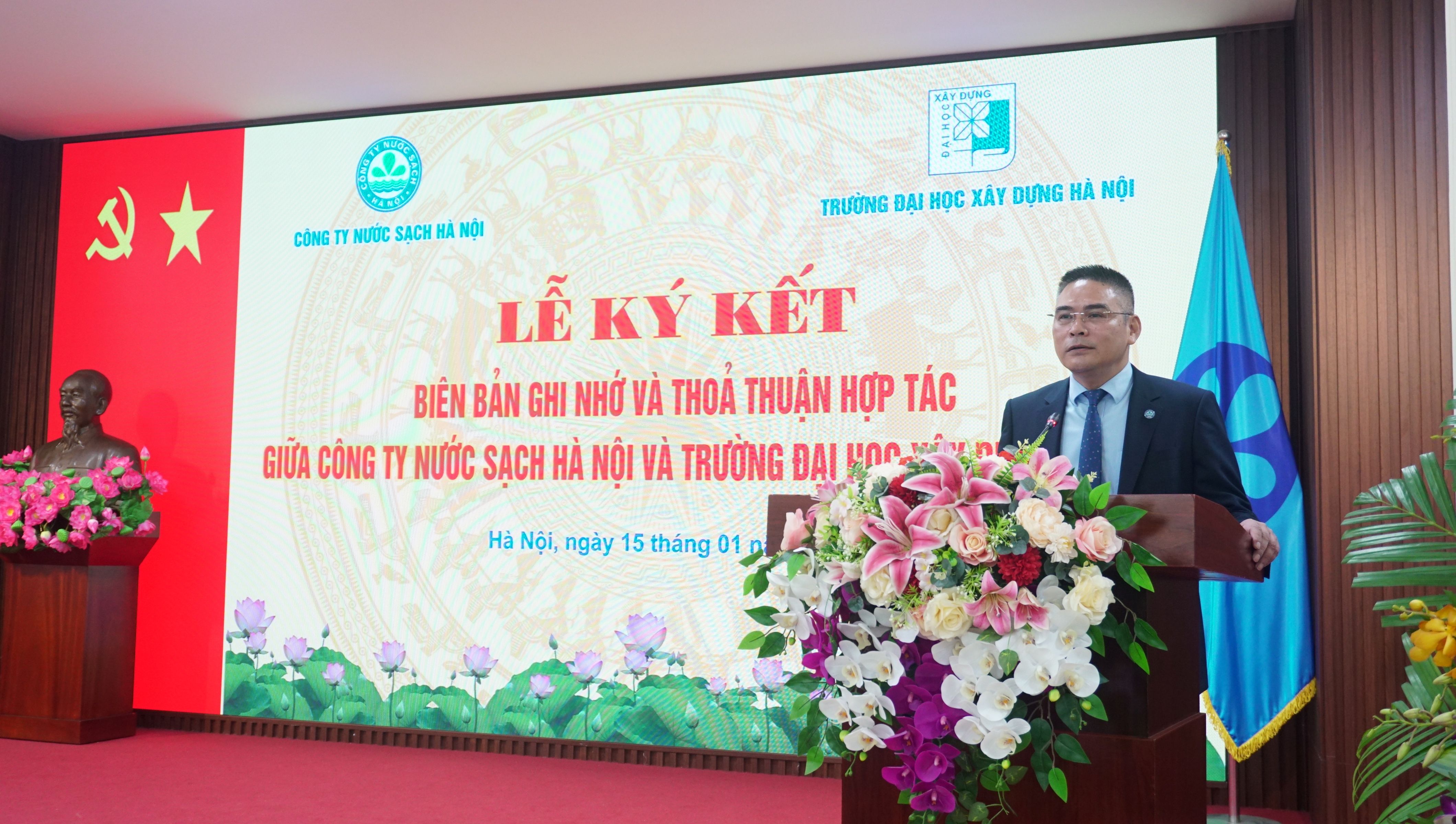 Ông Đặng Ngọc Hải, Tổng Giám đốc Công ty cho biết đây là lần ký kết thứ 2 trong hơn 10 năm qua giữa Công ty NSHN và trường Đại học Xây dựng. Với sự phát triển về khoa học công nghệ và yêu cầu về nguồn nhân lực chất lượng cao, việc hợp tác giữa nhà trường và doanh nghiệp trong đó có Công ty NSHN là đòi hỏi cần thiết trong thời điểm hiện tại. Hoạt động SXKD và dịch vụ khách hàng từ khâu vận hành nhà máy hệ thống mạng lưới đến chăm sóc khách hàng đang được chuyển đổi số và số hóa phương thức làm việc. Đây là nỗ lực của tập thể kỹ sư, CBCNV Công ty trong nhiều năm qua. Sau lễ ký kết ngày hôm nay, trường Đại học Xây dựng và Công ty sẽ triển khai các nội dung công việc cụ thể, thực hiện công tác sơ kết định kỳ kết quả thực hiện biên bản ghi nhớ, thỏa thuận hợp tác để có rà soát, đánh giá, điều chỉnh theo yêu cầu thực tế. Công ty cam kết sẵn sàng chia sẻ với nhà trường và sinh viên của trường các kinh nghiệm thực tiễn và cơ sở vật chất sẵn có để xây dựng mối gắn kết lâu dài giữa 2 bên.