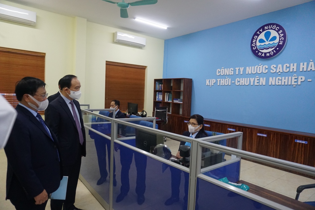 Phó Bí thư Thành ủy, Chủ tịch Hội đồng nhân dân Nguyễn Ngọc Tuấn tham quan bộ phận Chăm sóc khách hàng của Công ty Nước sạch Hà Nội.