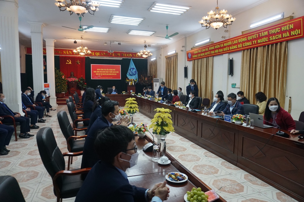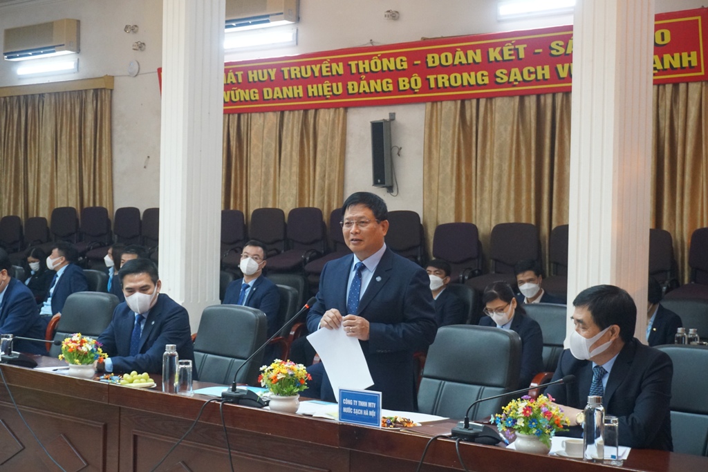 Thay mặt Ban lãnh đạo Công ty, ông Trần Quốc Hùng, Tổng Giám đốc đã báo cáo tóm tắt kết quả sản xuất kinh doanh năm 2021, kế hoạch sản xuất kinh doanh năm 2022 và kế hoạch cấp nước Tết Nguyên đán Nhâm dần 2022 của Công ty Nước sạch Hà Nội. Thực hiện nhiệm vụ chính trị của Thành ủy, UBND Thành phố giao, năm 2021, Công ty đã tiếp nhận hệ thống cấp nước khu công nghệ cao Hòa Lạc (huyện Thạch Thất), các trạm cấp nước nông thôn, khu làng nghề Bát Tràng (huyện Gia Lâm), đưa vào vận hành cấp nước song cùng với việc cấp nước ổn định cho các vùng bị ảnh hưởng môi trường của khu vực Sóc Sơn như khu Bãi rác Nam Sơn, Bắc Sơn, Hồng Kỳ.