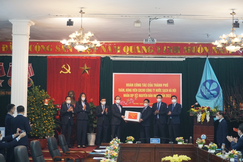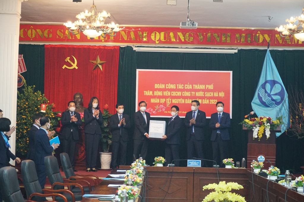 Đoàn công tác đã trao quà Tết của Thành phố đến Tập thể Ban lãnh đạo và CBCNV của Công ty Nước sạch Hà Nội.
